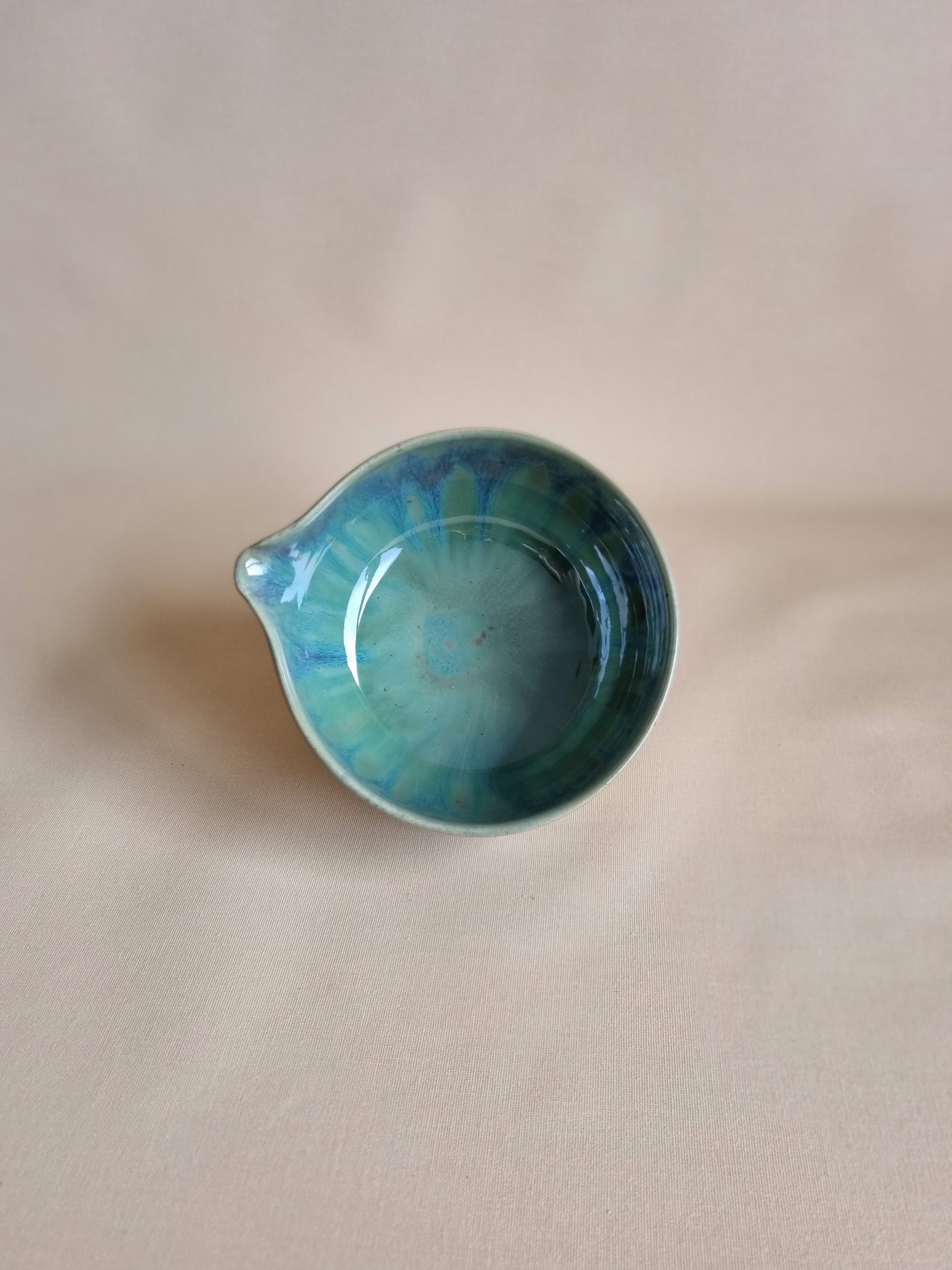 The katakuchi, matcha bowl with spout. Wheel-thrown and finished with layered glazes, each piece with its own unique character.