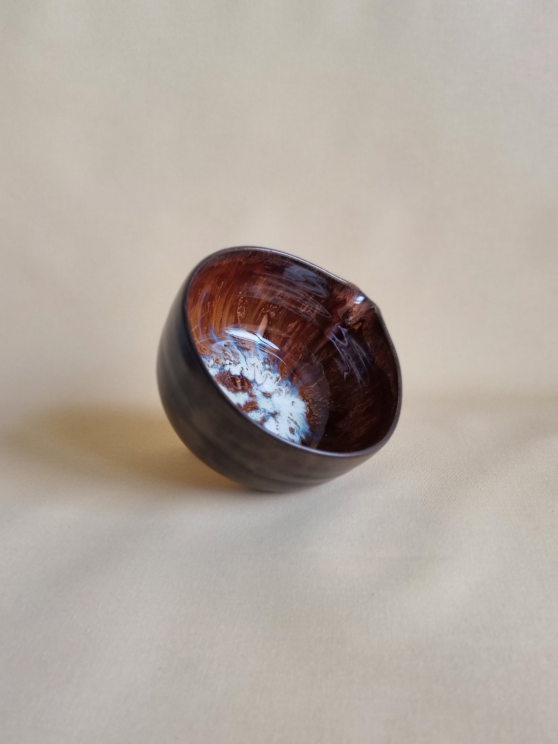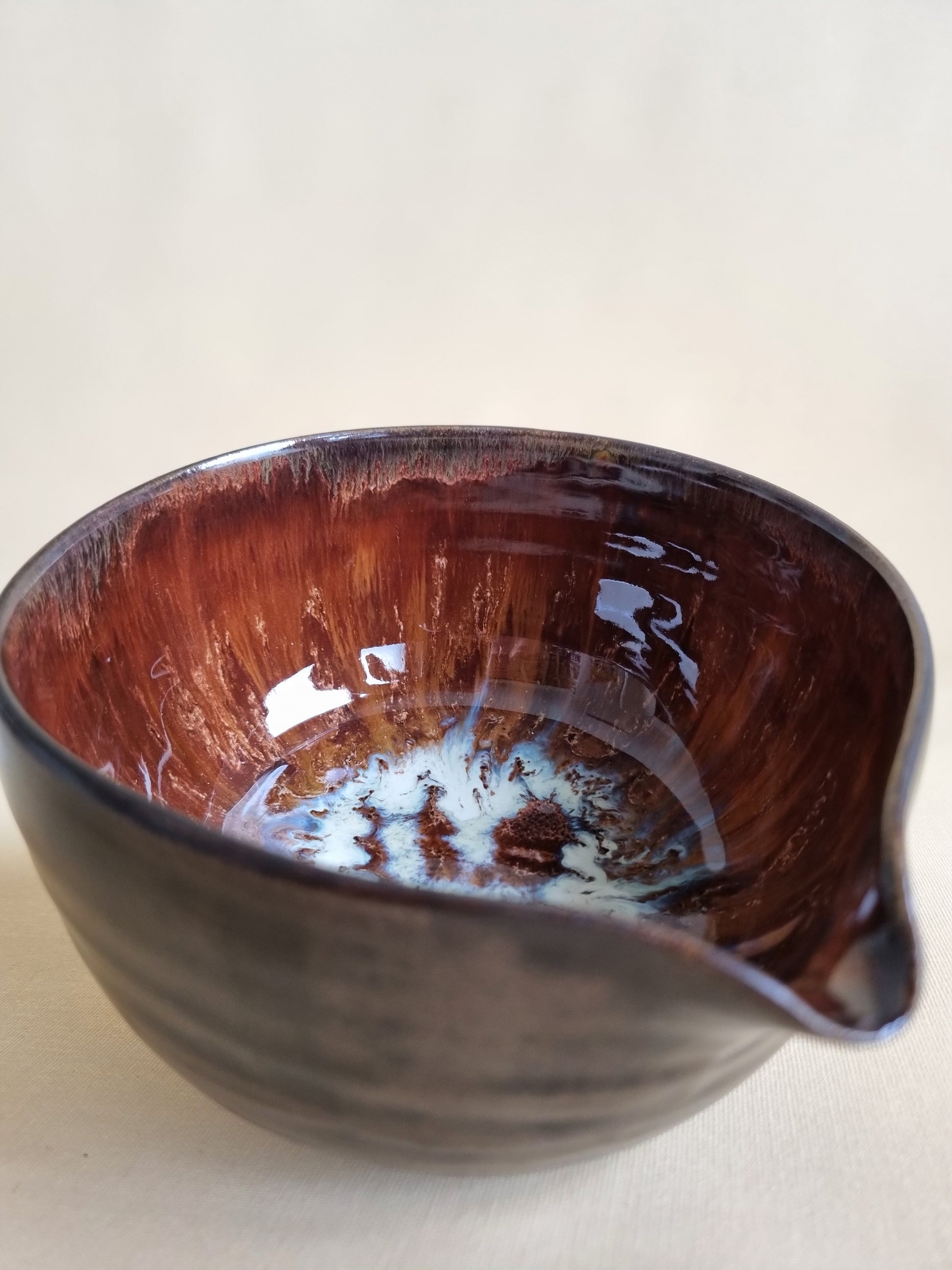 The katakuchi, matcha bowl with spout. Wheel-thrown and finished with layered glazes, each piece with its own unique character.